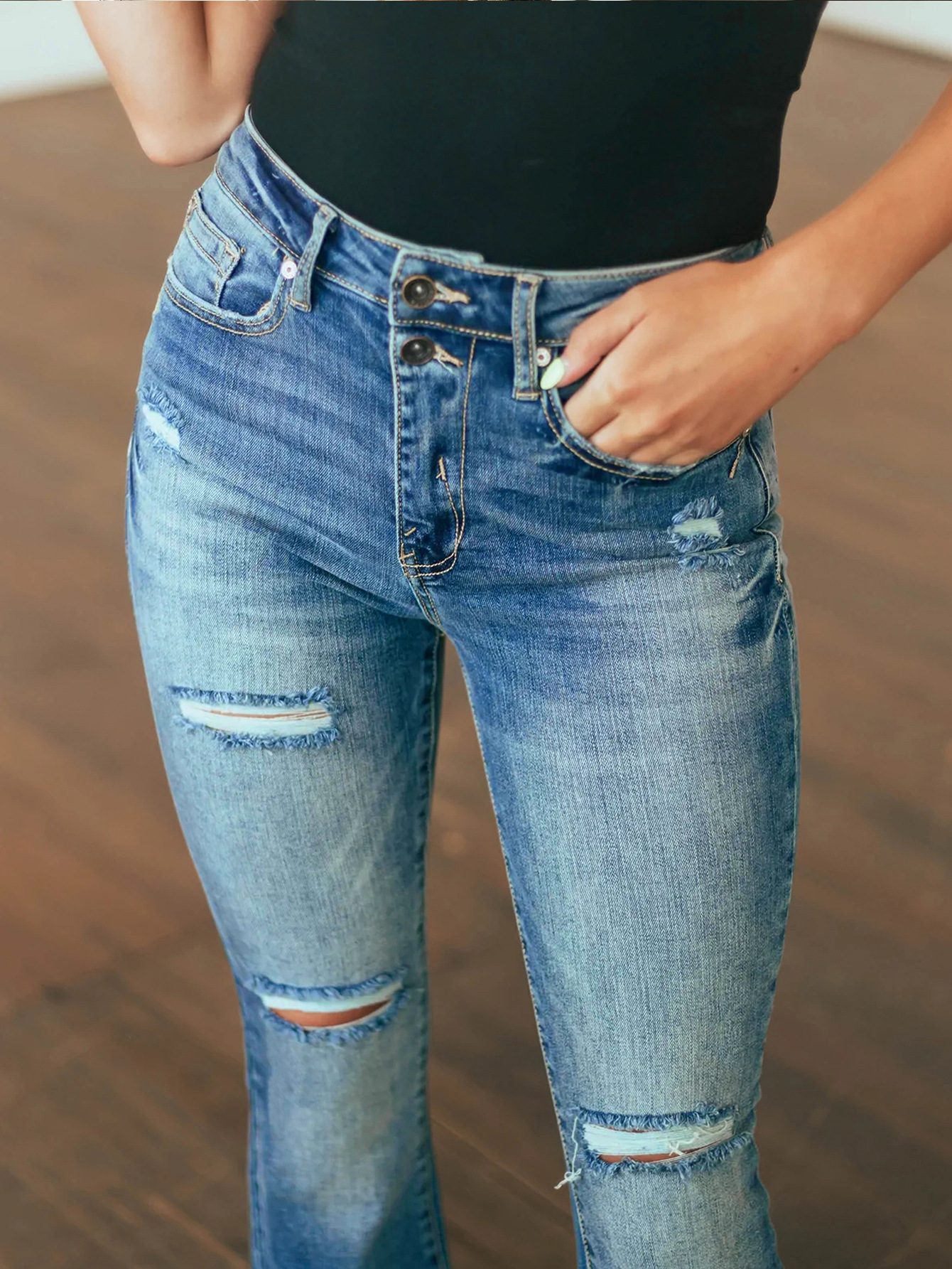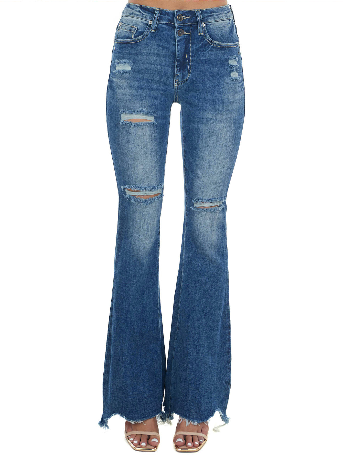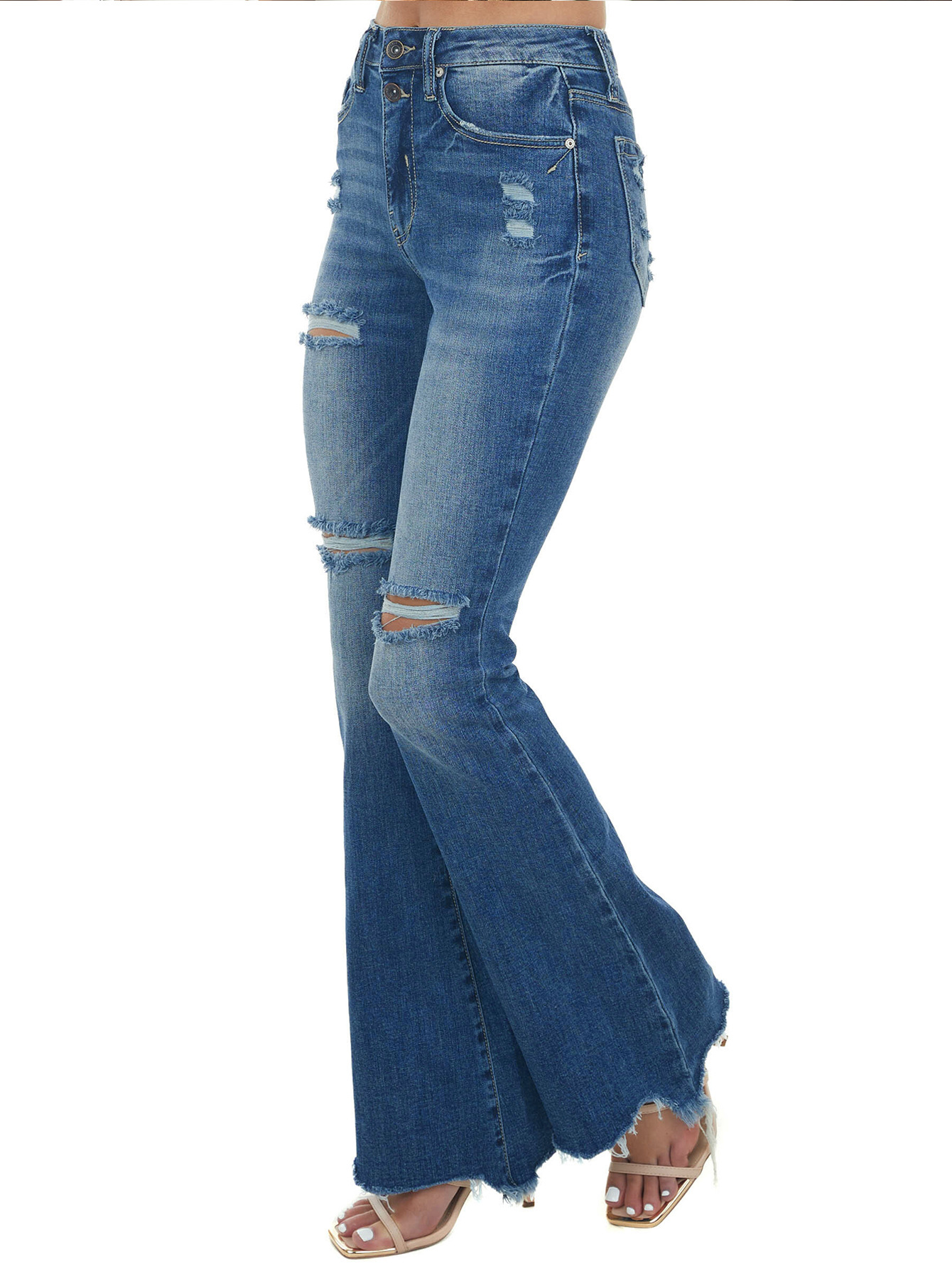 Jessica Slim Fit Elastic Hole Bell Bottom Pants Style: Casual