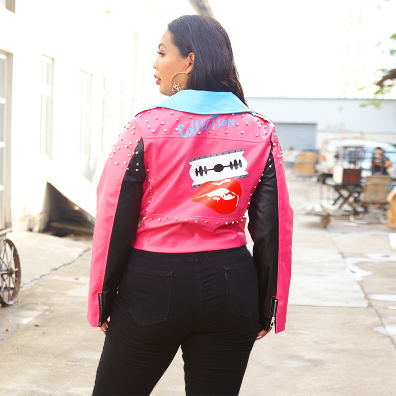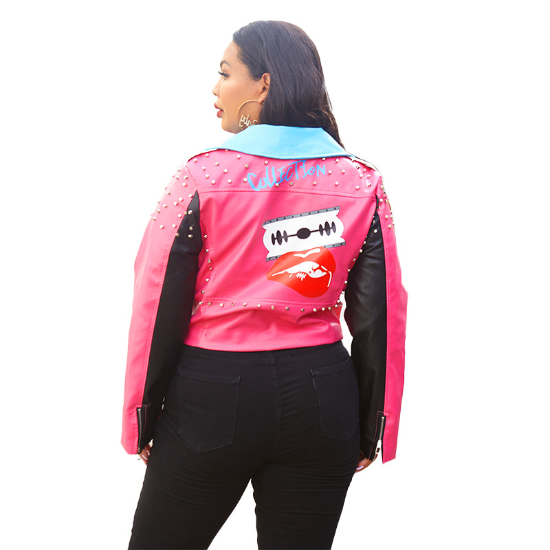 Molly Plus Size Cool Leather Rivet Printing Collared Contrast Jacket