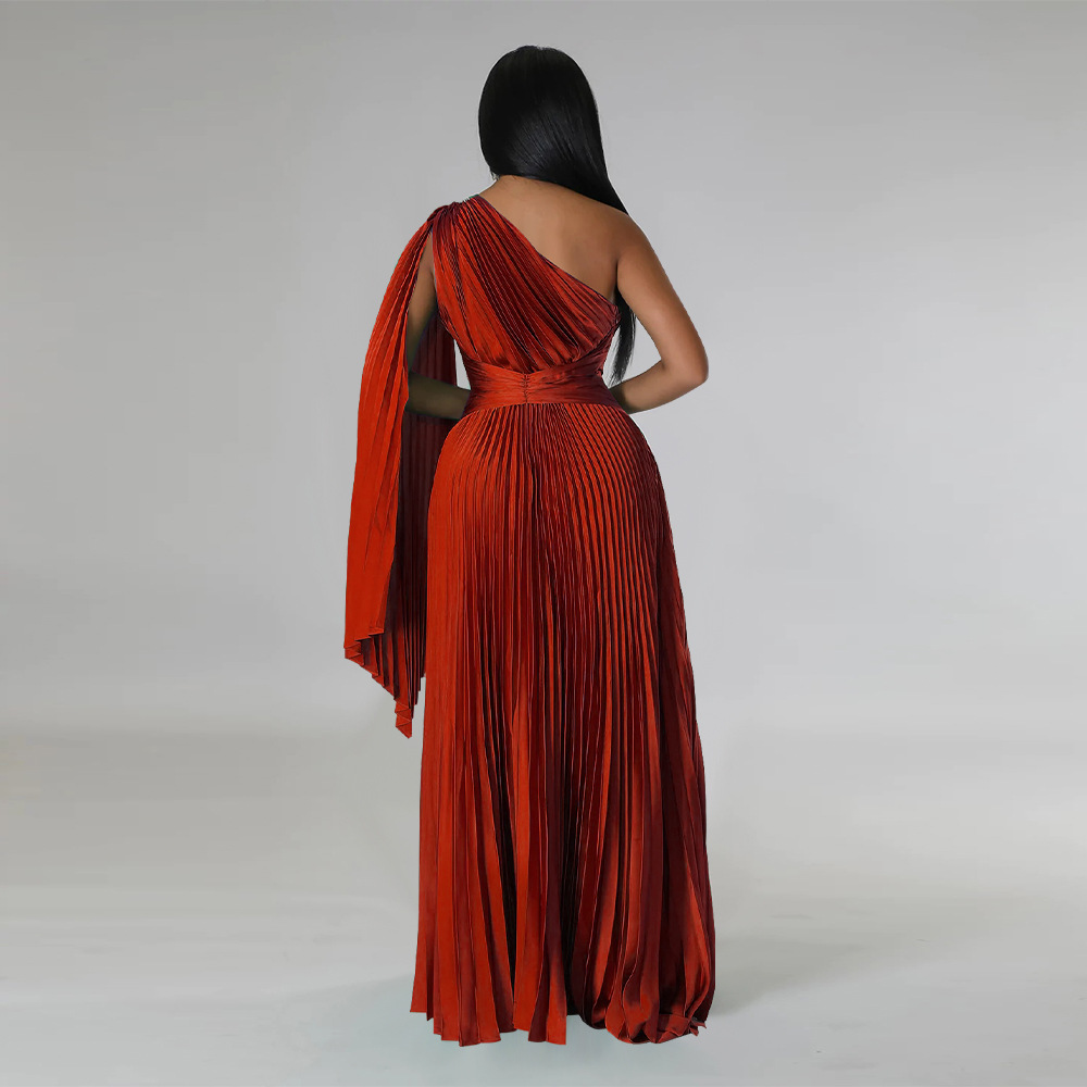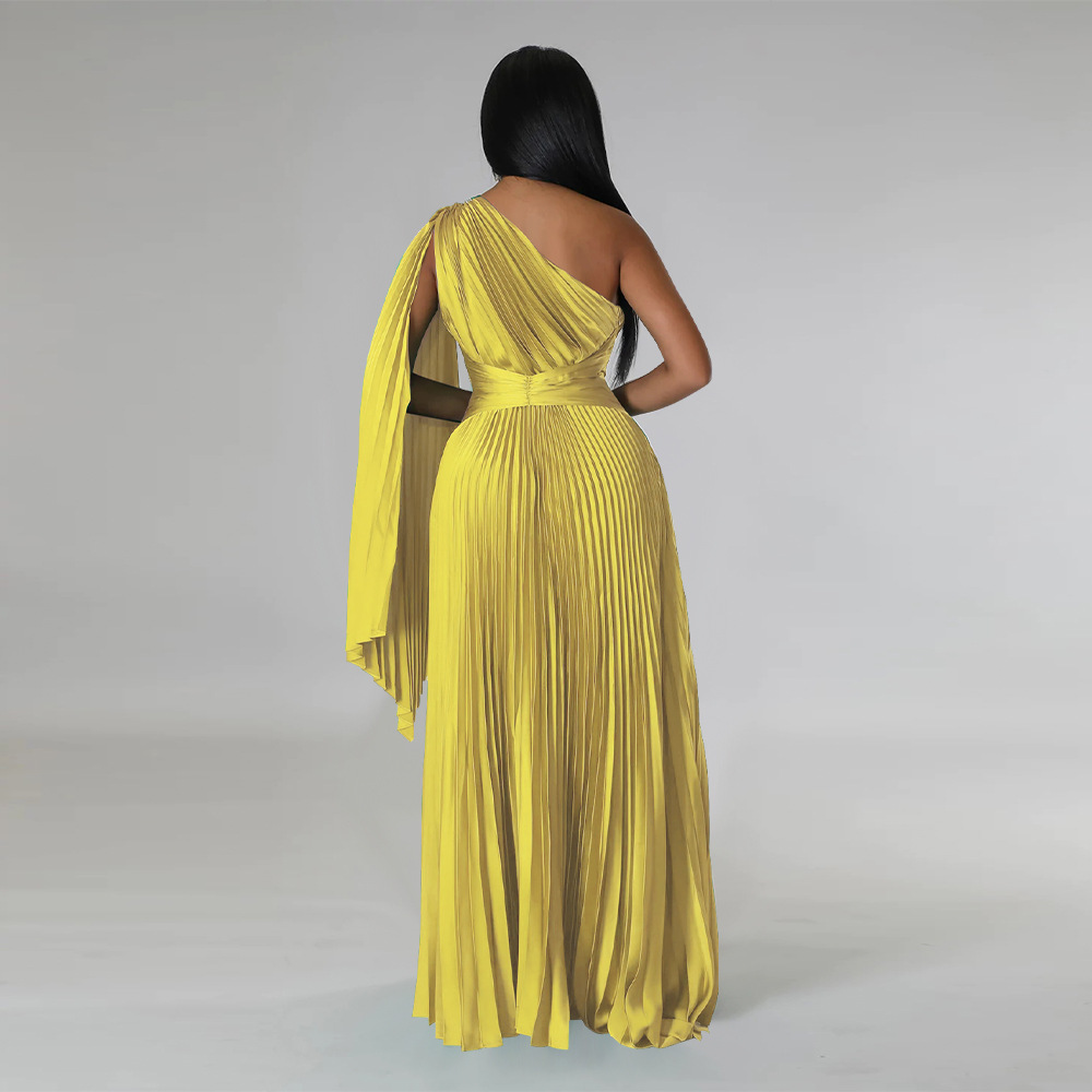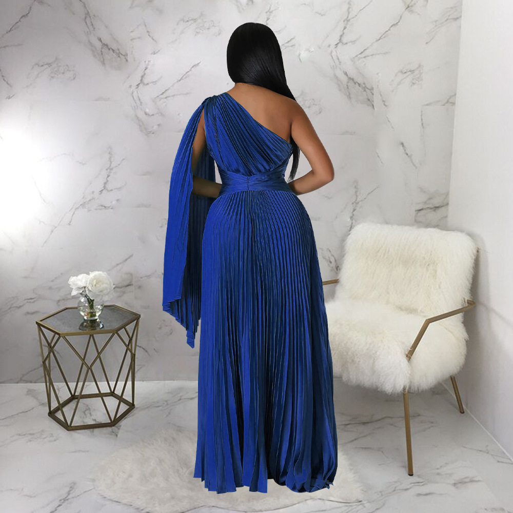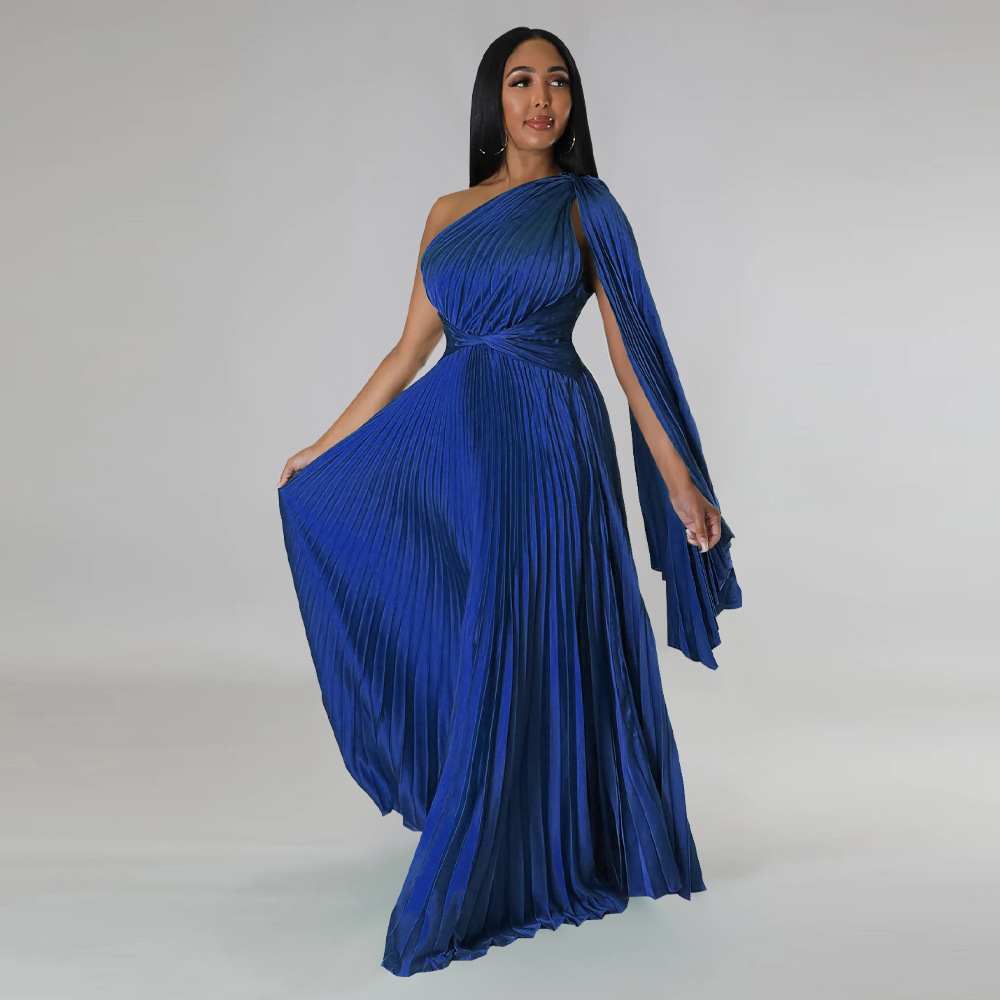 beronica Shoulder Pleated Diagonal Collar Tight Waist Artificial Dresses